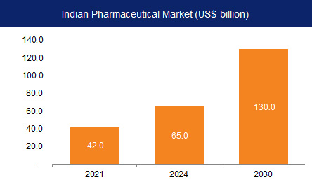 The Indian pharmaceutical industry has seen a massive expansion over the last few years and is expected to reach about 13% of the size of the global pharma market while enhancing its quality, affordability, and innovation. According to the Indian Economic Survey 2021, the domestic market is expected to grow 3x in the next decade. India’s domestic pharmaceutical market stood at US$ 42 billion in 2021 and is likely to reach US$ 65 billion by 2024 and further expand to reach US$ 120-130 billion by 2030. India's biotechnology industry comprises biopharmaceuticals, bio-services, bio-agriculture, bio-industry, and bioinformatics. The Indian biotechnology industry was valued at US$ 70.2 billion in 2020 and is expected to reach US$ 150 billion by 2025. India’s medical devices market stood at US$ 10.36 billion in FY20. The market is expected to increase at a CAGR of 37% from 2020 to 2025 to reach US$ 50 billion. As of August 2021, CARE Ratings expect India's pharmaceutical business to develop at an annual rate of ~11% over the next two years to reach more than US$ 60 billion in value.