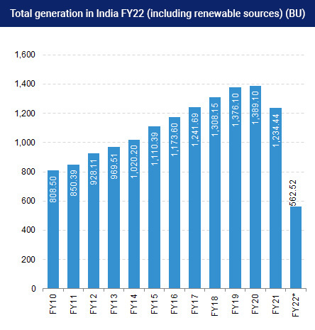 India's power generation witnessed its highest growth rate in over 30 years in FY23. Power generation in India increased by 8.87% to 1,624.15 billion kilowatt-hours (kWh) in FY23. According to data from the Ministry of Power, India's power consumption stood at 130.57 BU in April, 2023.