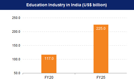 The education sector in India was estimated to be worth US$ 117 billion in FY20 and is expected to reach US$ 225 billion by FY25.